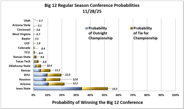 KU was not the biggest benefactor of the week in the Big 12. That would go to Iowa State. Iowa State really improved their standing. Look at the Big 12 projection below. Iowa State has overtaken Arizona to lead the projection for the Big 12 race. KU is still back in 5th place but gaining ground.