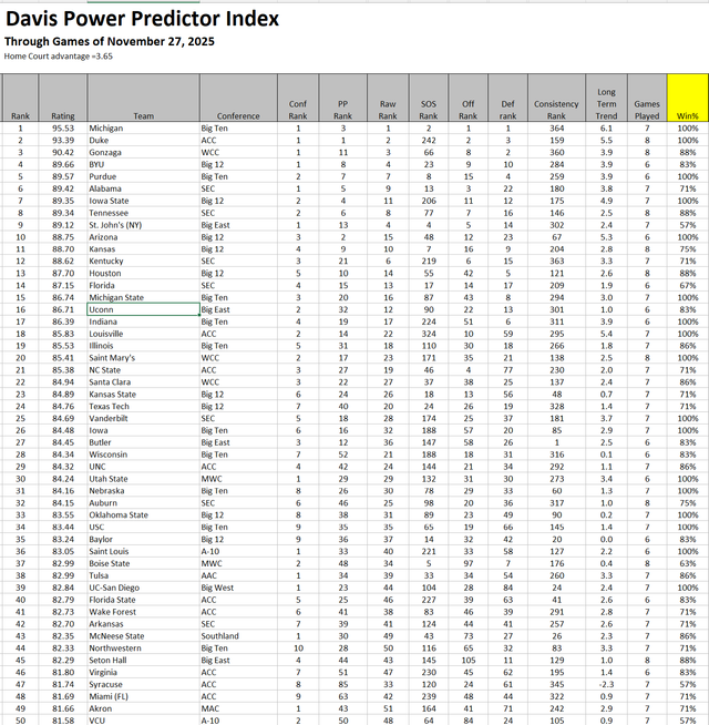 Unfortunately, KU's excellent performance in Las Vegas was matched by some other teams so KU has not moved up in the DPPI as much as I would have hoped. But what is happening is the teams are now bunched up a little more tightly. Michigan is by far the big winner of the week. They zoomed all the way into 1st replacing Duke. Duke is still a very strong 2nd place and Gonzaga is pretty solid in 3rd. But 4th through 12th are all bunched up pretty tightly. It will not take much for KU to move up. A decisive victory over UConn should do the trick. And you will be happy to know that as of right now, KU is a 3.2 point favorite against UConn in Lawrence. I'd say a 10 point victory would be a nice early Christmas present.