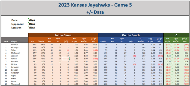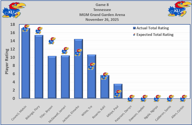 The player rating is an interesting chart from this game. We have yet to have a game where we are firing on all cylinders. But other than the second half of the UNC game, we have been able to cover for those players who are having off games. The last couple seasons, we had too many games where the whole team seemed to be in a funk. This season, we have yet to have every player firing live but like championship caliber teams, we pick up the slack with teammates rather than all follow into the black hole of funk. This game is a good example. We played a very good and very talented and very well-coached Tennessee. Not only that, but we got a solid punch in the mouth followed by an upper cut that had us down 12 points with 14 minutes to play. Then the dogs came out. Tiller was just unable to find the groove at all and Flory was completely bamboozled the first half. These are two of the three guys who have been carrying us this season. And they were struggling mightily. Flory recovered a bit in the second half but Bryson was just a little out of phase. But Tre was in full Batman and up steps Melvin and Elmarko with assists from Kohl and Jamari. And especially Elmarko. It was junkyard dog attack with grit and determination. Tennessee did not relax at all. In fact they intensified as well. We just intensified more. And for all the obvious accolades for the scoring of Elmarko and Melvin, this win was actuated on the defensive end. But it was on offense where the new mindset of Elmarko was on full display. He simply attacked. He lost all the reticence that has plagued and characterized his game. If this is a true growth moment for Elmarko and not just a fluke game, KU's future hopes just made a great leap. When you look at the chart below, one of the flukes is that Mbiya scored out so highly. Mbiya did play very well but in fact he was the benefactor of being in the game during those pivotal 3.3 minutes when Elmarko and Melvin donned the capes and KU outscored Tennessee 12-2 in those 3.3 minutes. And note the 2 points scored by Tennessee. That is 0.6 points per minute or less than 1/3rd of the rest of the game. Defense fed our offense. So had Tiller stayed in the game during those moments, he might have been the benefactor of that run. Then again, maybe Mbiya was a defensive factor.