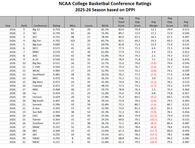 And speaking of conferences, The Big 12 maintained its dominance but just barely over the SEC. But those two are both well ahead of the ACC. The Big Ten is even farther back and the Big East is truly the weakest thus far this season. TCU helped the cause of the Big 12 with a victory over Florida yesterday. Once again, look at the SOS for the Big 12. It is not even close. The Big 12 has played a SOS so much stronger than all the other Power 5 conferences.